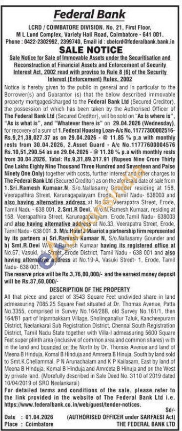DESCRIPTION OF THE PROPERTY : All that piece and parcel of 3543 Square Feet undivided share in land admeasuring 7085.25 Square Feet situated at Dr. Thomas Avenue, Patta No.3355, comprised in Survey No. 164/288, old Survey No. 161/1, then 164/81 part of Injambakkam Village, Sholinganallur Taluk, Kancheepuram District, Neelankarai Sub Registration District, Chennai South Registration District, Tamil Nadu State together with Villa-1 admeasuring 5600 Square Feet super plinth area (inclusive of common area and common shares) with in the land and bounded on the North by Dr. Thomas Avenue and land of Meena B Hinduja, Komal B Hinduja and Amreeta B Hinuja, South by land sold to Smt. K.Chellammal, P N Arunachalam and KP Kailasam, East by land of Meena B Hinduja, Komal 8 Hinduja and Amreeta B Hinuja and on the West by private land. (Morefully described in Sale Deed No. 3110 of 2019 dated 10/04/2019 of SRO Neelankarai)
