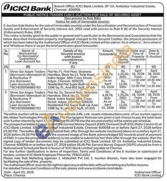 Flat No. S1, Second Floor, Sivarams Hamilton, Block No.13, TNHB Road, Indira Nagar 28th Cross Street, Adyar, Chennai-600020. Residential Flat Super Built-Up Area 1596 Sq. ft., and 601 Sq.ft., of UDS