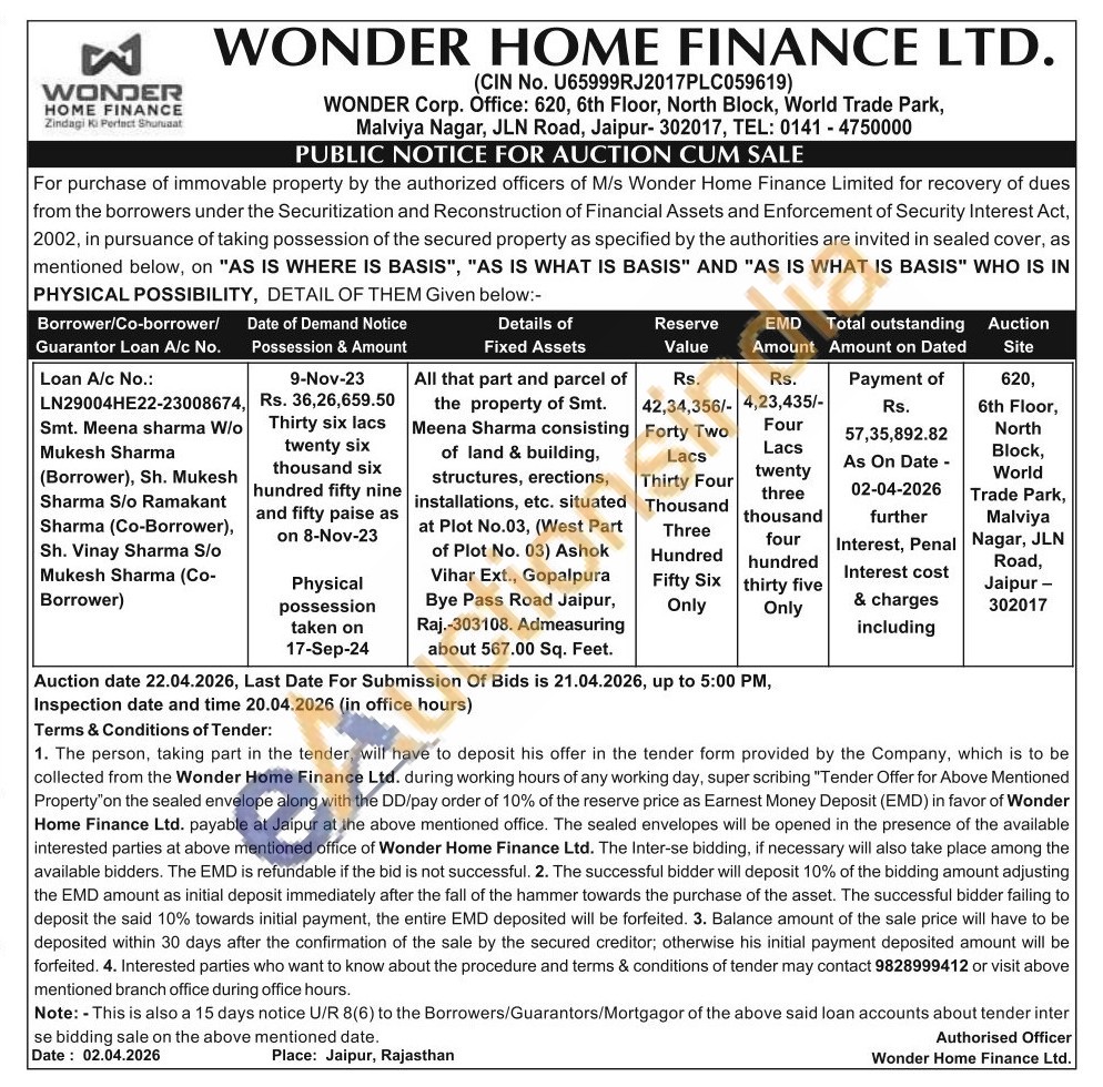 All that part and parcel of the property of Smt. Meena Sharma consisting of land & building, structures, erections, installations, etc. situated at Plot No.03, (West Part of Plot No. 03) Ashok Vihar Ext., Gopalpura Bye Pass Road Jaipur, Raj.-303108. Admeasuring about 567.00 Sq. Feet