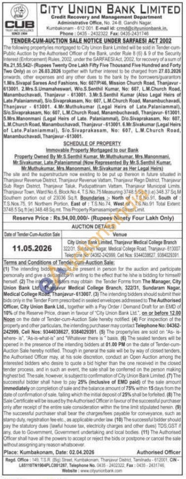 The site and the superstructure now existing to be put up thereon in future situated in Thanjavur Revenue District, Thanjavur Ravenue Vattam, Thanjavur Regn District. Thanjavur Sub Regn District, Thanjavur Taluk, Pudupattinam Vattam, Thanjavur Municipal Limits Thanjavur Town, Ward No. 6. Block No.4, TS No.75 Measuring 3748.5 Sq ft (e) 348.37 54 M Southem portion out of 23036 Sq.ft. Boundaries North of TS.No.91, South of: TS. Nos 75, 91 Northem Portion, East of TS No. 74. West of: TS. No.91 Total Extent 3748.5 Sq.ft (e) 348 48 Sq.mt. This Property Ramasamipettai Street Limit.