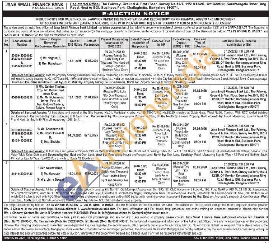 Details of Secured Assets: All that piece and parcel of the Site bearing No.01, Municipal Khatha No. 189/2/3907, PID No.88220, situated at Gubbi Gate, Ward No.07, Tumkur. With RCC roofed building and Bounded: On the East by: Site belonging to H Ayub Khan, On the West by: Site belonging to Mohamme Aftab, On the North by: Private Properly. On the South by: Road. Measuring East to West: 35 Ft and North to South 30 Ft in all measuring 1050 Sq.ft