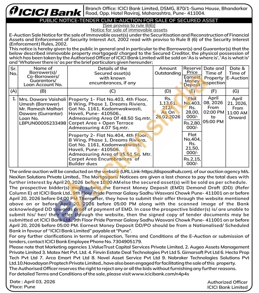 Property 1- Flat No.403, 4th Floor, Haveli, Pune 410506., B Wing, Phase 1, Dreams Riviera, Gat No. 1161, Kadamwakwasti, Admeasuring Area Of 48.50 Sq.mtr. Carpet Area + Open Terrace Admeasuring 4.07 Sq.mtr.