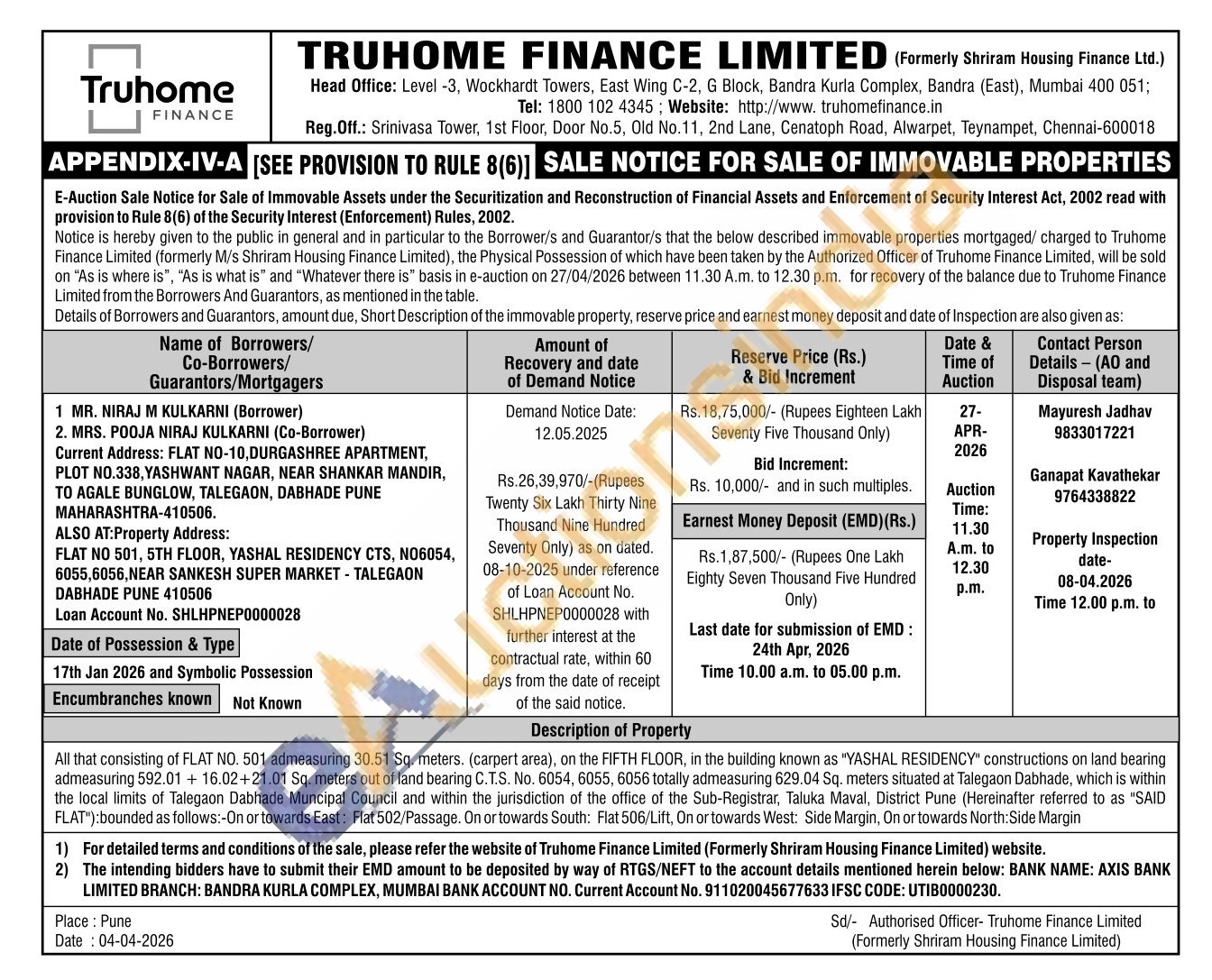 All that consisting of FLAT NO. 501 admeasuring 30.51 Sq. meters. (carpert area), on the FIFTH FLOOR, in the building known as "YASHAL RESIDENCY" constructions on land bearing admeasuring 592.01 + 16.02+21.01 Sq. meters out of land bearing C.T.S. No. 6054, 6055, 6056 totally admeasuring 629.04 Sq. meters situated at Talegaon Dabhade, which is within the local limits of Talegaon Dabhade Muncipal Council and within the jurisdiction of the office of the Sub-Registrar, Taluka Maval, District Pune (Hereinafter referred to as "SAID FLAT"): bounded as follows:-On or towards East: Flat 502/Passage. On or towards South: Flat 506/Lift, On or towards West: Side Margin, On or towards North: Side Margin