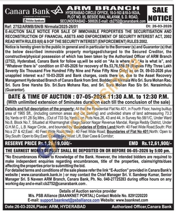 All that the Residential Flat No.401, in Fourth Floor, having builtup area of 1965 Sft., (including common areas and car parking) and undivided share of land admeasuring 73.3 Sq. Yards or 61.28 Sq.Mtrs., (Out of 733 Sq. Yards), on Plots Nos.26, 43 and 44, in Survey No.58/1/C, Under Ward No.8, Block No.7, Situated at Kharmanghat village, Saroor Nagar Revenue Mandal, Ranga Reddy District, Under G.H.M.C., L.B. Nagar Circle., and bounded by: Boundaries of Entire Land: North: 40 Feet Wide Road; South: Plot No.s 27 & 42;East: 40 Feet Wide Road; West: 40 Feet Wide Road; Boundaries of Flat No 401:North: Open to Sky, South: Open to Sky, East: Open to Sky, West: Lift, Stair Case & Corridor;