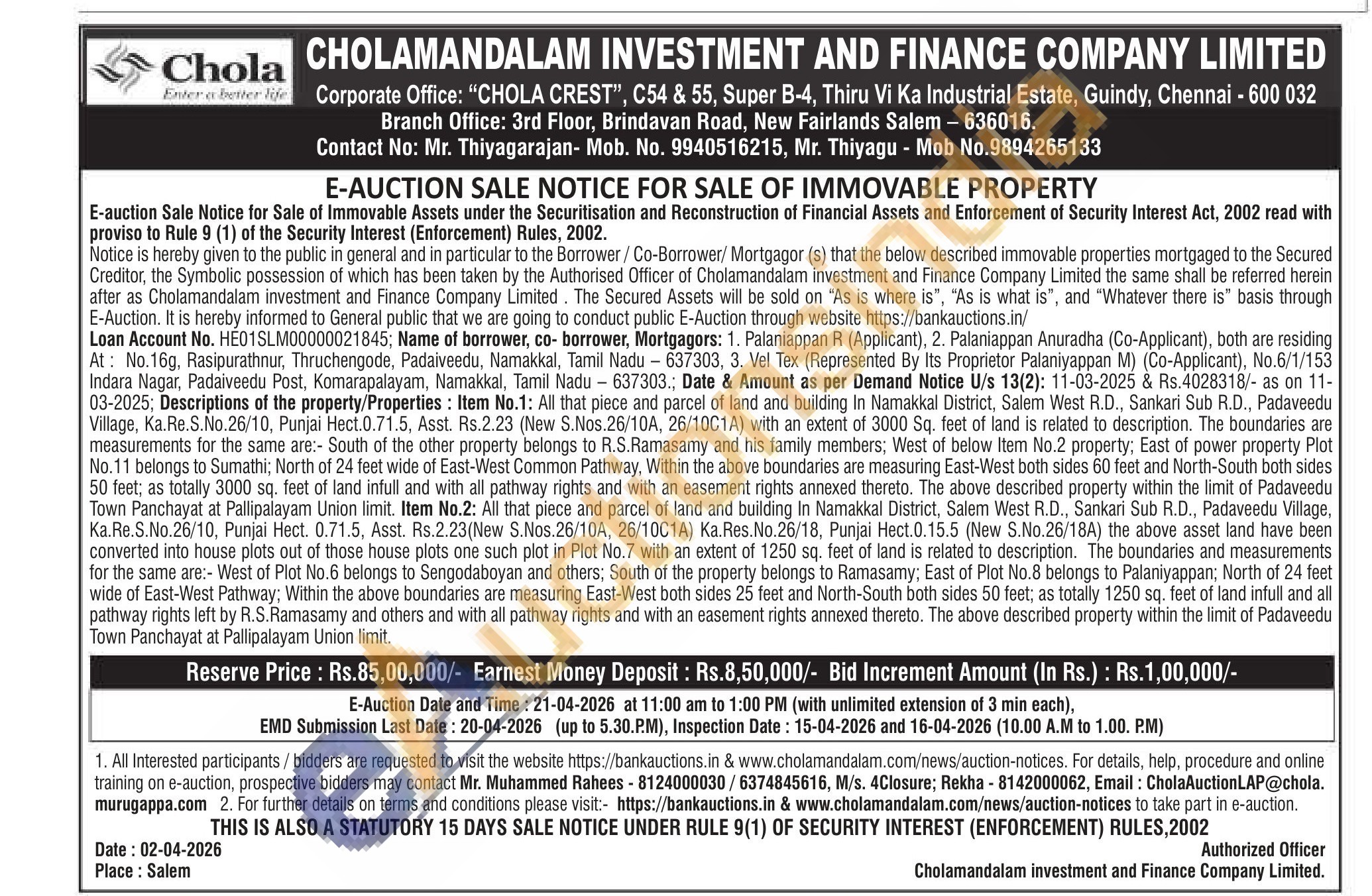 Descriptions of the property/Properties: Item No.1: All that piece and parcel of land and building In Namakkal District, Salem West R.D., Sankari Sub R.D., Padaveedu Village, Ka.Re.S.No.26/10, Punjai Hect.0.71.5, Asst. Rs.2.23 (New S.Nos.26/10A, 26/10C1A) with an extent of 3000 Sq. feet of land is related to description. The boundaries are measurements for the same are: South of the other property belongs to R.S.Ramasamy and his family members; West of below Item No.2 property; East of power property Plot No.11 belongs to Sumathi; North of 24 feet wide of East-West Common Pathway, Within the above boundaries are measuring East-West both sides 60 feet and North-South both sides 50 feet; as totally 3000 sq. feet of land infull and with all pathway rights and with an easement rights annexed thereto. The above described property within the limit of Padaveedu Town Panchayat at Pallipalayam Union limit. Item No.2: All that piece and parcel of land and building In Namakkal District, Salem West R.D., Sankari Sub R.D., Padaveedu Village, Ka.Re.S.No.26/10, Punjai Hect. 0.71.5, Asst. Rs.2.23(New S.Nos.26/10A, 26/10C1A) Ka.Res.No.26/18, Punjai Hect.0.15.5 (New S.No.26/18A) the above asset land have been converted into house plots out of those house plots one such plot in Plot No.7 with an extent of 1250 sq. feet of land is related to description. The boundaries and measurements for the same are:- West of Plot No.6 belongs to Sengodaboyan and others; South of the property belongs to Ramasamy; East of Plot No.8 belongs to Palaniyappan; North of 24 feet wide of East-West Pathway; Within the above boundaries are measuring East-West both sides 25 feet and North-South both sides 50 feet; as totally 1250 sq. feet of land infull and all pathway rights left by R.S.Ramasamy and others and with all pathway rights and with an easement rights annexed thereto. The above described property within the limit of Padaveedu Town Panchayat at Pallipalayam Union limit.