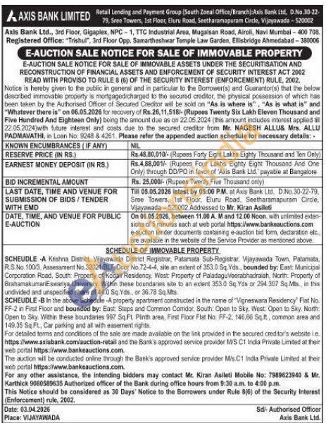 SCHEUDLE A Krishna District, Vijayawada District Registrar, Patamata Sub-Registrar. Vijayawada Town, Patamata. R.S.No. 100/3, Assessment No.32021/BLT, Door No.72-4-4, site an extent of 353.0 Sq. Yds, bounded by: East: Municipal Corporation Road, South Property of Kodali Residency. West: Property of PaladaguVeerabhadraiah, North: Property of BrahamakumaniEswariya University. Within these boundaries site to an extent 353.0 Sq. Yds or 294,307 Sq.Mts in this undivided and unspecified share of 44.0 Sq. Yds, or 36.78 Sq.Mts. SCHEUDLE-B In the above Schedule -A property apartment constructed in the name of "Vigneswara Residency" Flat No. FF-2 in First Floor and bounded by: East: Steps and Common Comidor, South: Open to Sky. West. Open to Sky, North Open to Sky. Within these boundaries 997 Sq.Ft. Pinth area, First Floor Flat No. FF-2, 146.66 Sq.ft., common area and 149.35 Sq Ft., Car parking and all with easement rights For detailed terms and conditions of the sale are made available on the link provided in the secured creditor's website le https://www.axisbank.com/auction-retail and the Bank's approved service provider MIS C1 India Private Limited at their web portal https://www.bankeauctions.co