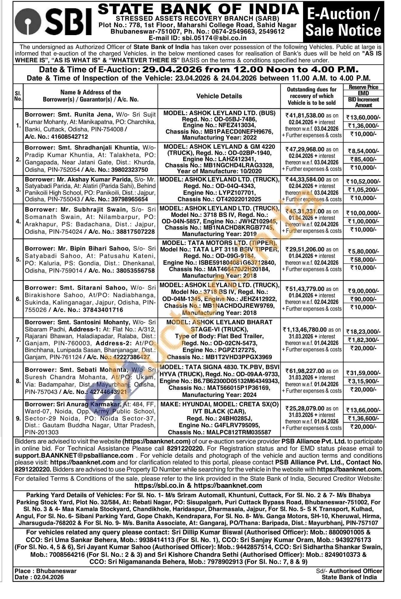 MODEL: ASHOK LEYLAND LTD. (TRUCK), Model No.: 3718 BS IV, Regd. No.: OD-04M-1345, Engine No.: JEHZ412922, Chassis No.: MB1NACHDOJREW9769, Manufacturing Year: 2018