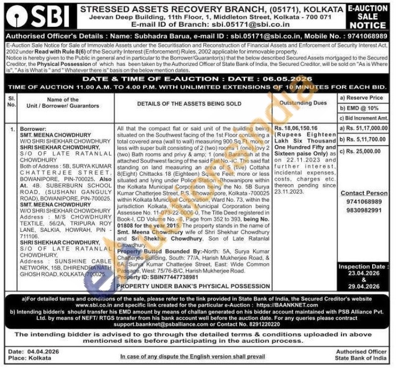 All that the compact flat or said unit of the building being situated on the Southwest facing of the 1st Floor containing a total covered area (wall to wall) measuring 900 Sq.Ft. more or less with super built consisting of 2 (two) rooms 1 (one) lovy 2 (two) Bath rooms and privy & amp; 1 (one) Barandah at the attached Southwest facing of the said Flat No.-IC. The said flat standing on land measuring an area of 5 (five) Cottaha 8(Eight) Chittacks 18 (Eighteen) Square Feet, more or less situated and lying under Police Station -Bhowanipore within the Kolkata Municipal Corporation being the No. 5B Surya Kumar Chatterjee Street, P.S.-Bhowanipore, Kolkata-700025 within Kolkata Municipal Corporation, Ward No. 73, within the jurisdiction Kolkata, Kolkata Municipal Corporation being Assessee No. 11-073-22-0006-0. The Title Deed registered in Book-I, CD Volume No.- 8, Page from 352 to 393, being No. 01808 for the year 2015. The property stands in the name of Smt. Meena Chowdhury wife of Shri Shekhar Chowdhury and Sri Shekhar Chowdhury. Son of Late Ratanlal Chowdhury.