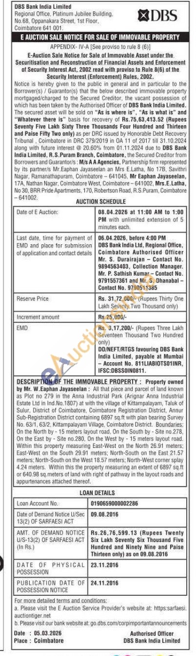 by Mr. W.Eaphan Jayaseelan: All that piece and parcel of land known as Plot no 279 in the Anno Industrial Park (Arignar Anna Industrial Estate Ltd in Ind. No. 1807) at with the village of Kittampalayam, Taluk of Sulur, District of Coimbatore, Coimbatore Registration District, Annur Sub-Registration District containing 6897 sq.ft with plan bearing Survey No. 63/1. 63/2. Kittampalayam Village, Coimbatore District. Boundaries: On the North by 15 meters layout road. On the South by Site no 278, On the East by-Site no.280, On the West by-15 meters layout road. Within this property measuring East-West on the North 26.91 meters East-West on the South 29.91 meters; North-South on the East 21.57 meters: North-South on the West 18.57 meters: North-West corner splay 4.24 meters. Within this the property measuring an extent of 6897 sq ft or 640.90 sq.meters of land with right of pathway in the layout roads and appurtenances attached thereof.