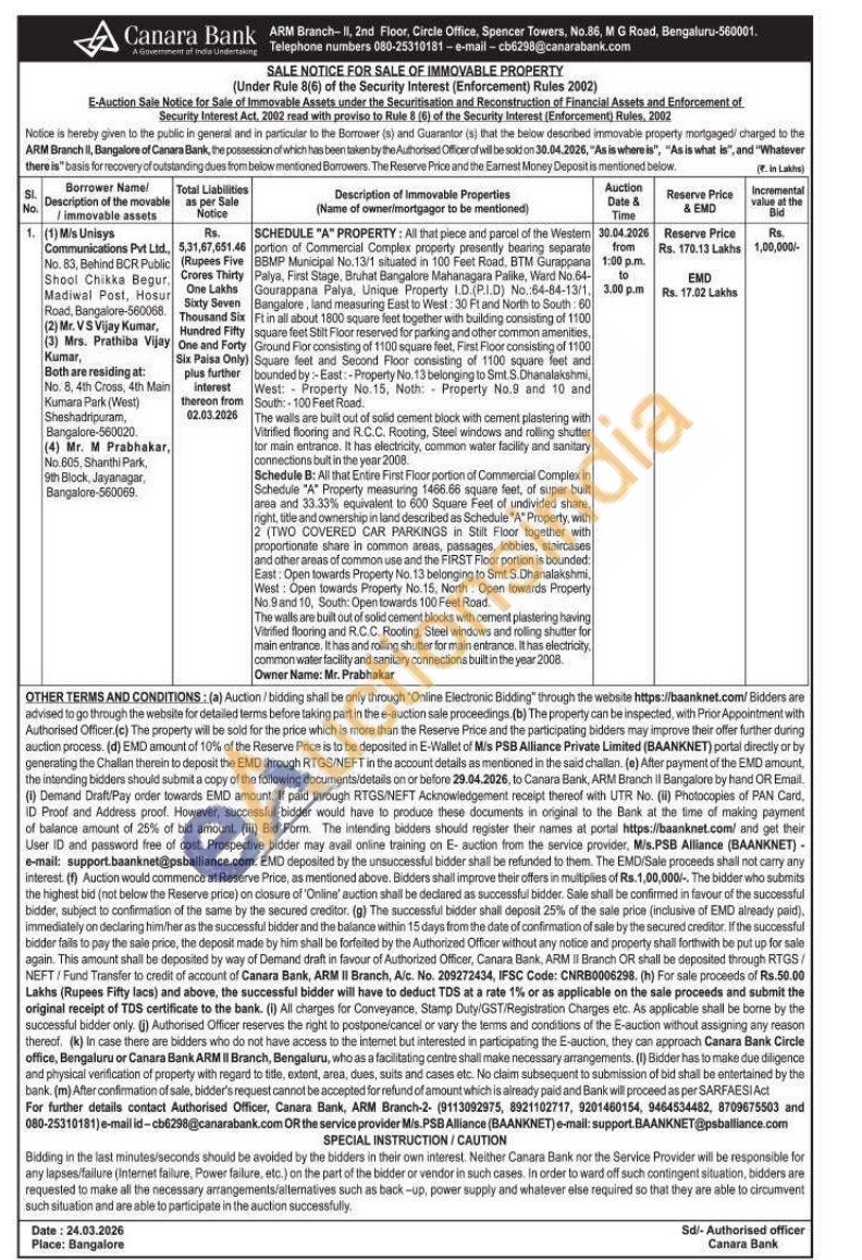 SCHEDULE "A" PROPERTY: All that piece and parcel of the Westem portion of Commercial Complex property presently bearing separate BBMP Municipal No.13/1 situated in 100 Feet Road, BTM Gurappana Palya, Finst Stage, Bruhat Bangalore Mahanagara Palike, Ward No 64-Gourappana Palya, Unique Property I.D. (P.I.D) No. 64-84-13/1, Bangalore, land measuring East to West: 30 Ft and North to South 60 Ft in all about 1800 square feet together with building consisting of 1100 square feet Stilt Floor reserved for parking and other common amenities, Ground Flor consisting of 1100 square feet, First Floor consisting of 1100 ) Square feet and Second Floor consisting of 1100 square feet and bounded by: East:-Property No. 13 belonging to Smt. S.Dhanalakshmi, West: Property No. 15. Noth: Property No.9 and 10 and South:-100 Feet Road.