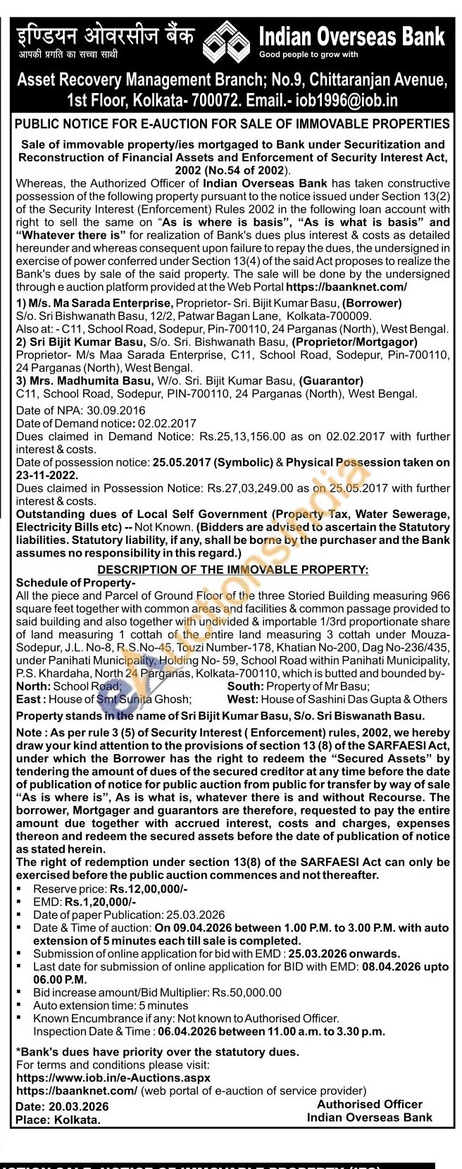 Schedule of Property- All the piece and Parcel of Ground Floor of the three Storied Building measuring 966 square feet together with common areas and facilities & common passage provided to said building and also together with undivided & importable 1/3rd proportionate share of land measuring 1 cottah of the entire land measuring 3 cottah under Mouza-Sodepur, J.L. No-8, R.S.No-45, Touzi Number-178, Khatian No-200, Dag No-236/435, under Panihati Municipality, Holding No-59, School Road within Panihati Municipality, P.S. Khardaha, North 24 Parganas, Kolkata-700110, which is butted and bounded by-North: School Road; South: Property of Mr Basu; East: House of Smt Sunita Ghosh: West: House of Sashini Das Gupta & Others