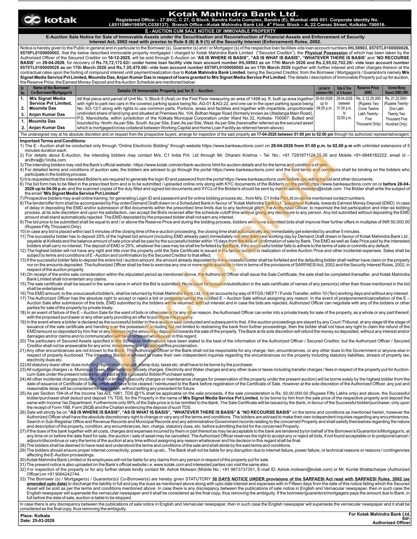 Mr. Ashok Motwani (Mobile No .: +91 9873737351, or Mr. Kuntal Bhattacharjee (Authorized Officer) on +91 9064242744.