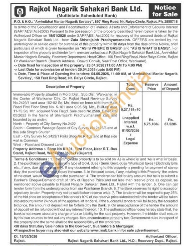 Immovable Property situated in Morbi Dist., Sub Dist. Wankaner, in the Center of Wankaner City, On Rajkot Road Revenue Survey No.2423/1 land area 102-02 Sq. Mtr, there on Inner side from Main Road First Floor Shop No. K-101 area 9-96 Sq. Mtr.. Built-up area 11-75 Sq. Mtr. acquired Vide Regd. Sale deed No.2566, Dated.03 05/2023 in the Name of Shivrajsinh Pradhyumansinh Zala and bounded by as under: North Property of City Survey No.2422 South Common Passage Space of City Survey No.2423/5 and at this side Shop's Shutter East City Survey No. 2423/1 Paiki Shop No.K-102 and at that side wall is Common West-Road and Disused Land