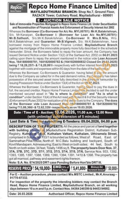 All the piece and parcel of land together with building situated at Mayiladuthurai Registration District, Kuthalam Sub-Registry, Kuthalam Taluk, Kuthalam Vattam, Kuthalam, Uthiramela Street, comprised in Survey No. 153/1 is bounded as follows: West of Road, East of: Saminathan Pillai house, North of. M.C.Balu building and backyard, South of Kovil Mandapam. Admeasuring: East to West on both sides: 44 feet, South to North on both sides: 34 feet, Totally 1496 sq.ft. The property bears Door Nos. 37. 37A, 378, 370, 370, 37/1, 37/2, 37/3, 37/4, 37/5, 37/6, Service Nos. 933, 1392. 1393, 1395, 1397, 1388, 1389, 1390, 1394, 1391, 1410 & 1398. The property has got all mamool, pathway and easement rights thereon