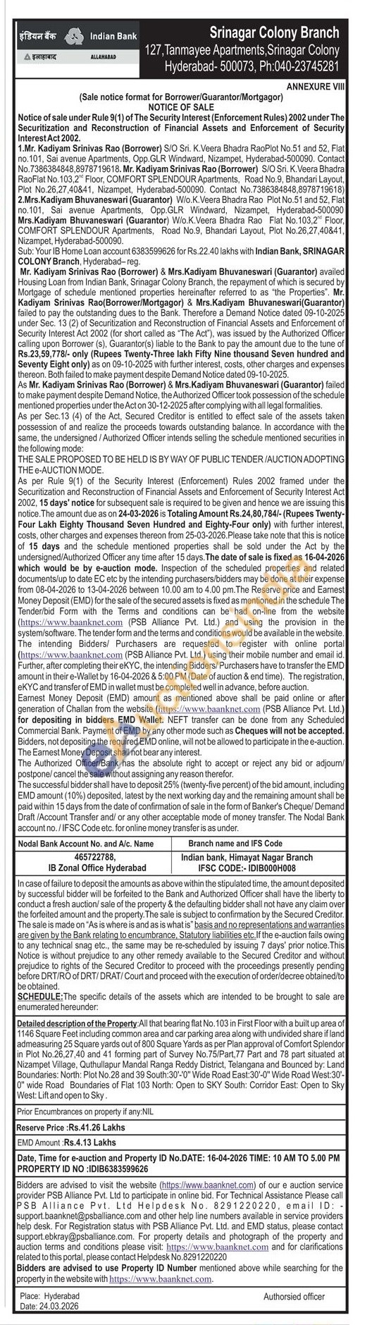 Detailed description of the Property: All that bearing flat No. 103 in First Floor with a built up area of 1146 Square Feet including common area and car parking area along with undivided share if land admeasuring 25 Square yards out of 800 Square Yards as per Plan approval of Comfort Splendor in Plot No.26,27,40 and 41 forming part of Survey No.75/Part, 77 Part and 78 part situated at Nizampet Village, Quthullapur Mandal Ranga Reddy District, Telangana and Bounced by: Land Boundaries: North: Plot No.28 and 39 South:30'-'0" Wide Road East:30'-0" Wide Road West:30'-0" wide Road Boundaries of Flat 103 North: Open to SKY South: Corridor East: Open to Sky West: Lift and open to Sky.