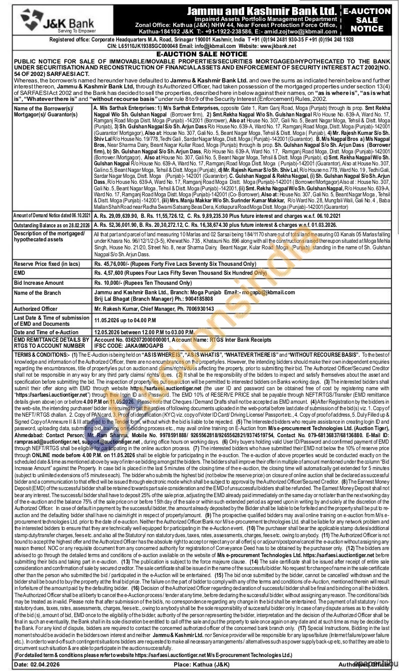 All that partand parcel of land measuring 10 Marlas and 02 Sarsai being 184/1170 share out of total land measuring 03 Kanals 05 Martas falling under Khasra No. 96/12/1/2 (3-5), Khewat No. 735. Khatauni No. 896 along with all the constructions raised thereupon situated at Moga Menia Singh, House No. 21/20, Street No. 8. near Sharma Dairy Beant Nagar, Kuier Road Moga (Punjab) standing in the name of Sh. Gulshan Nagpal Sto Sh. Arjun Dass