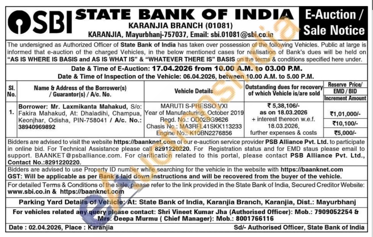 Shri Vineet Kumar Jha (Authorised Officer): Mob.: 7909052254 & Mrs. Deepa Murmu (Chief Manager): Mob.: 8001766116