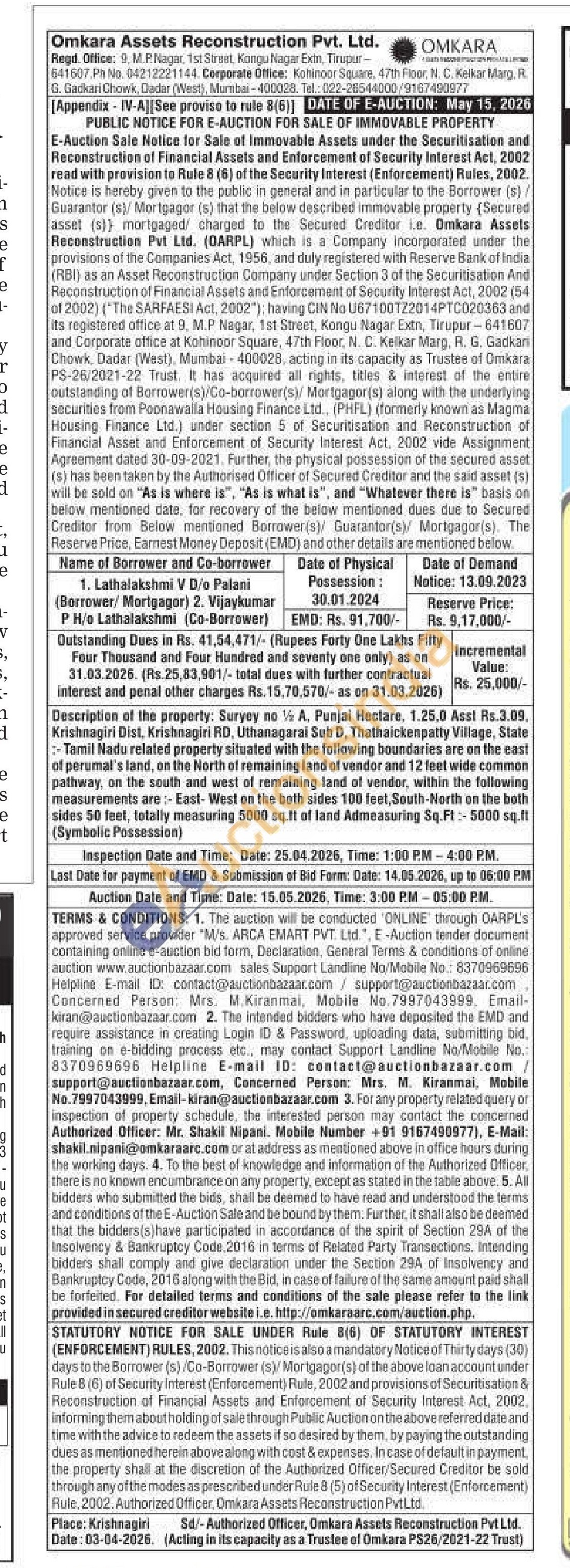 Description of the property: Suryey no ½ A, Punjai Hectare, 1.25.0 Assl Rs.3.09. Krishnagiri Dist, Krishnagiri RD, Uthanagarai Sub D, Thathaickenpatty Village, State - Tamil Nadu related property situated with the following boundaries are on the east of perumal's land, on the North of remaining land of vendor and 12 feet wide common pathway, on the south and west of remaining land of vendor, within the following measurements are: East-West on the both sides 100 feet, South-North on the both sides 50 feet, totally measuring 5000 sq.ft of land Admeasuring Sq.Ft:- 5000 sq.ft (Symbolic Possession)
