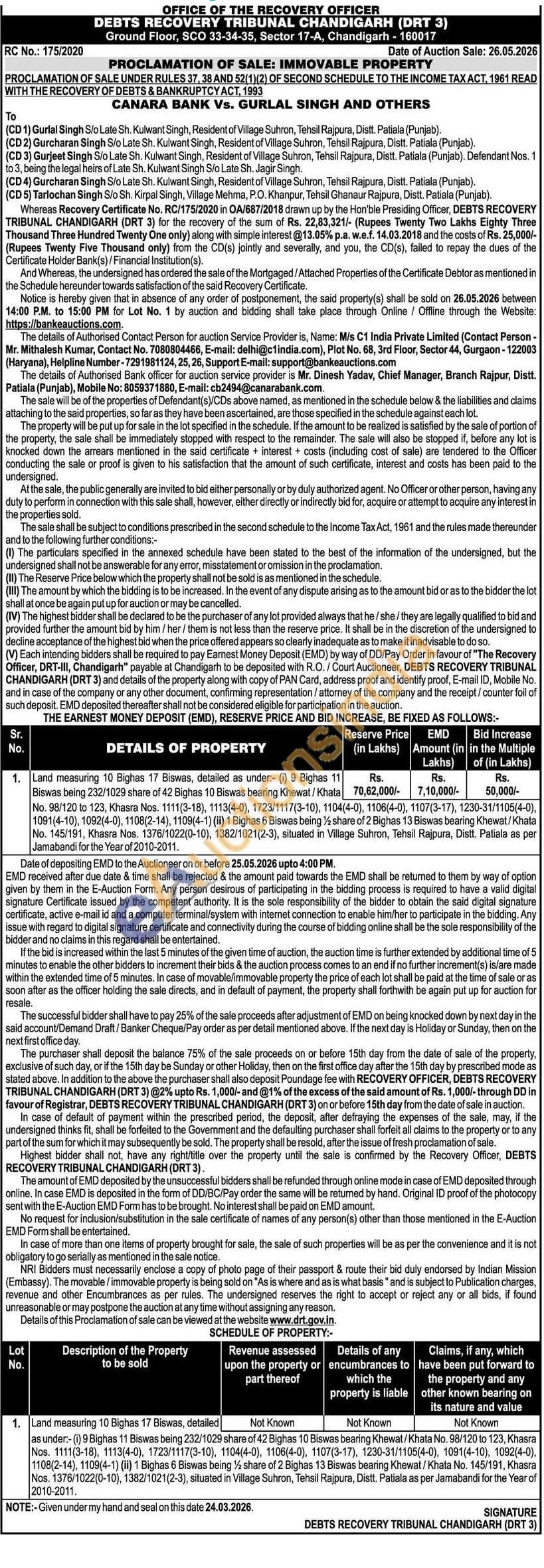 Land measuring 10 Bighas 17 Biswas, detailed as under:- (i) 9 Bighas 11 Biswas being 232/1029 share of 42 Bighas 10 Biswas bearing Khewat/Khata 70,62,000/-No. 98/120 to 123, Khasra Nos. 1111(3-18), 1113(4-0), 1723/1117(3-10), 1104(4-0), 1106(4-0), 1107(3-17), 1230-31/1105(4-0), 1091(4-10), 1092(4-0), 1108(2-14), 1109(4-1) (ii) 1 Bighas 6 Biswas being 1½ share of 2 Bighas 13 Biswas bearing Khewat/Khata No. 145/191, Khasra Nos. 1376/1022(0-10), 1382/1021(2-3), situated in Village Suhron, Tehsil Rajpura, Distt. Patiala as per Jamabandi for the Year of 2010-2011.