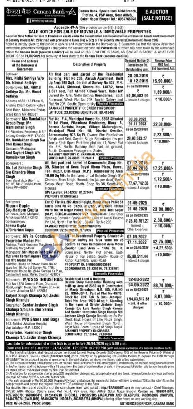Emt Of Flat No.202 Akruti Height, Mouja Itawa Ph No 51 Circle Bina Kh No. 312/3, 312/127, 312/199/2 Pathak Word No 10 Nagar Palika Bina Teh. Bina Dist Sagar (M.P) CERSAL: 400065301777 Boundaries: East Door Opening Common Space, West Land of Aknuti Devcon Pvt.Ltd, North Flat No 201, South: Fiat No 203 BAANKNET PROPERTY ID: CHABNIPURNS975 COORDINATES: 24.183018, 784-100