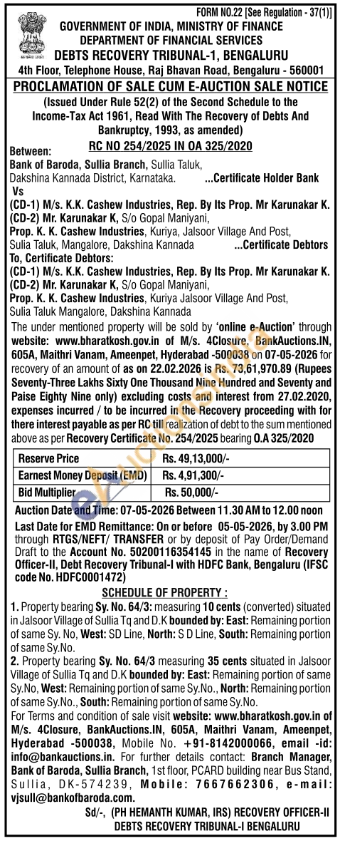Property bearing Sy. No. 64/3: measuring 10 cents (converted) situated in Jalsoor Village of Sullia Tq and D.K bounded by: East: Remaining portion of same Sy. No, West: SD Line, North: SD Line, South: Remaining portion of same Sy. No.