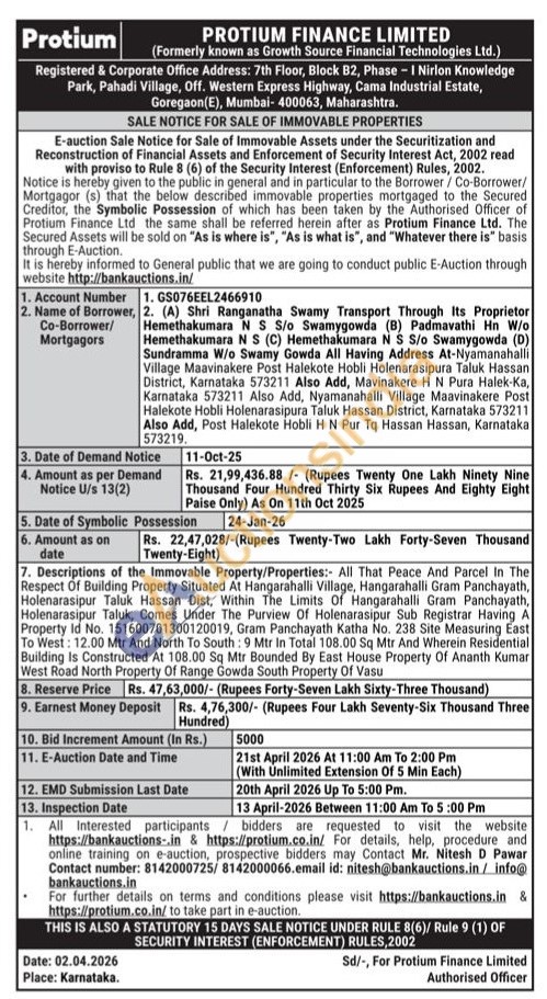 All That Peace And Parcel In The Respect Of Building Property Situated At Hangarahalli Village, Hangarahalli Gram Panchayath, Holenarasipur Taluk Hassan Dist, Within The Limits Of Hangarahalli Gram Panchayath, Holenarasipur Taluk, Comes Under The Purview Of Holenarasipur Sub Registrar Having A Property Id No. 151600701300120019, Gram Panchayath Katha No. 238 Site Measuring East To West: 12.00 Mtr And North To South: 9 Mtr In Total 108.00 Sq Mtr And Wherein Residential Building Is Constructed At 108.00 Sq Mtr Bounded By East House Property Of Ananth Kumar West Road North Property Of Range Gowda South Property Of Vasu