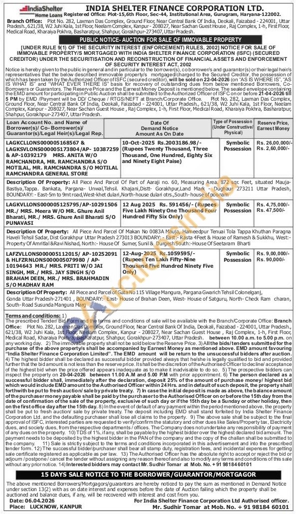 Description Of Property: All Piece And Parcel Of Part of Aaraji no. 60, Measuring Area. 872 sqr. Feet, situated Mauja-Bastiya, Tappa. Bankata, Pargana- Unwal, Tehsil. Khajani, Distt Gorakhpur, Land Mark Dughaur 273211 Uttar Pradesh, BOUNDARY: East-5m to 9mt road, West-khet dulari, North-house dulari otrs., South-house of poonam