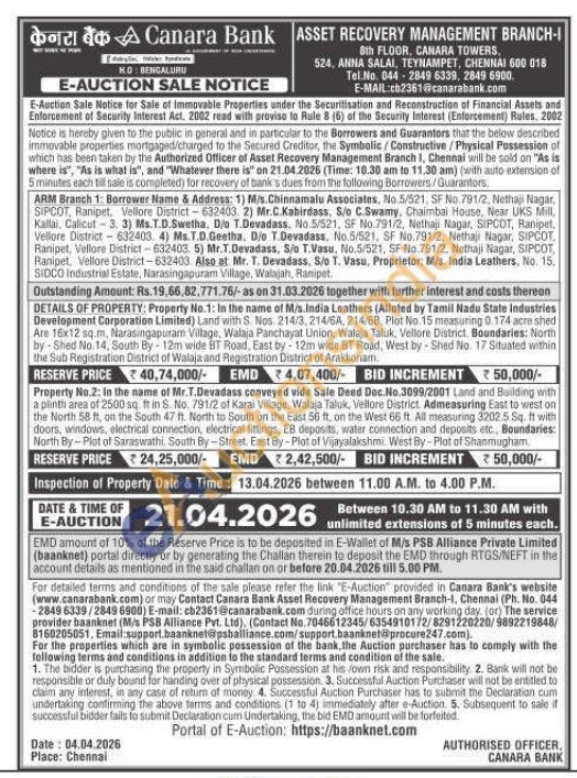 Property No.1: In the name of M/s India Leathers (Alloted by Tamil Nadu State Industries Development Corporation Limited) Land with S. Nos. 214/3, 214/6A, 214/68, Plot No. 15 measuring 0.174 acre shed Are 16x12 sq.m, Narasingapuram Village, Walaja Panchayat Union, Walaja Taluk, Vellore District Boundaries: North by-Shed No. 14, South By-12m wide BT Road, East by 12m wide BT Road, West by-Shed No. 17 Situated within the Sub Registration District of Walaja and Registration District of Arakkonam.