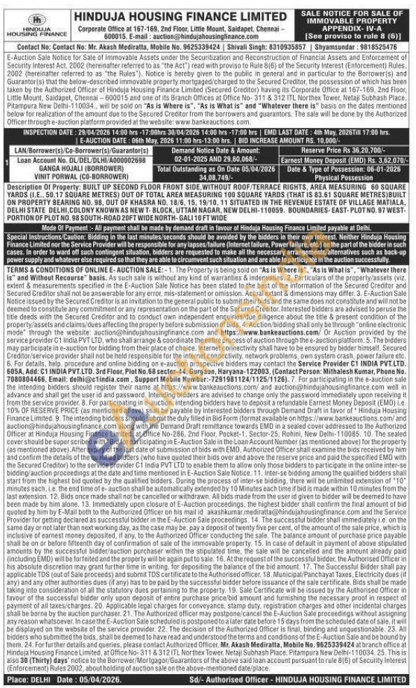 Description Of Property: BUILT UP SECOND FLOOR FRONT SIDE, WITHOUT ROOF/TERRACE RIGHTS, AREA MEASURING 60 SQUARE YARDS (1.E.. 50.17 SQUARE METRES) OUT OF TOTAL AREA MEASURING 100 SQUARE YARDS (THAT IS 83.61 SQUARE METRES) BUILT ON PROPERTY BEARING NO. 98, OUT OF KHASRA NO. 18/6, 15, 19/10, 11 SITUATED IN THE REVENUE ESTATE OF VILLAGE MATIALA, DELHI STATE DELHI, COLONY KNOWN AS NEW T-BLOCK, UTTAM NAGAR, NEW DELHI-110059. BOUNDARIES-EAST-PLOT NO. 97 WEST- PORTION OF PLOT NO. 98 SOUTH-ROAD 20FT WIDE NORTH-GALI 10 FT WIDE