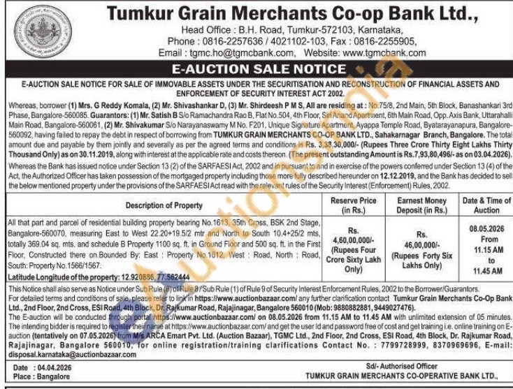 All that part and parcel of residential building property bearing No. 1613, 35th Cross, BSK 2nd Stage, Bangalore-560070, measuring East to West 22.20+19.5/2 mir and North to South 10.4+25/2 mts, totally 369.04 sq. mts, and schedule B Property 1100 sq. ft. in Ground Floor and 500 sq. ft. in the First Floor, Constructed there on Bounded By: East Property No.1612, West Road, North Road, South: Property No. 1566/1567.