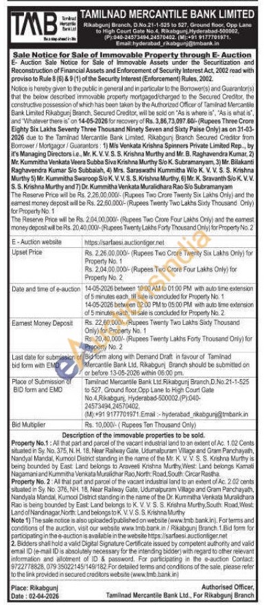 Property No.1: All that part and parcel of the vacant industrial land to an extent of Ac. 1.02 Cents situated in Sy. No. 375, N. H. 18. Near Railway Gate. Udumalpuram Village and Gram Panchayath, Nandyal Mandal, Kurnool District standing in the name of the Mr. K. V. V. S. S. Krishna Murthy is being bounded by East Land belongs to Araveeli Krishna Murthy West: Land belongs Kamali Nagamani and Kummitha Venkata Muralidhar Rao, North: Road, South Circar Rastha