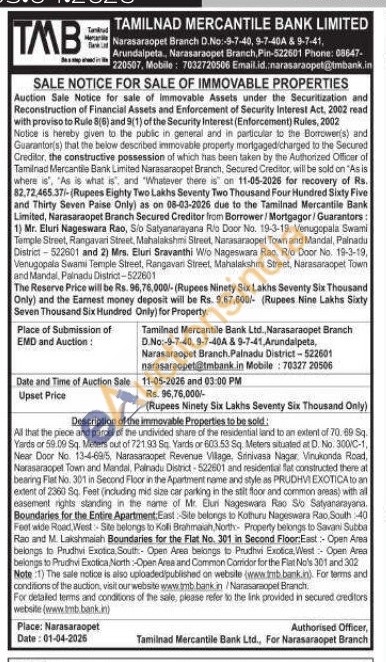 All that the piece and parcel of the undivided share of the residential land to an extent of 70. 69 Sq. Yards or 59.09 Sq. Meters out of 721.93 Sq. Yards or 603.53 Sq. Meters situated at D. No. 300/C-1, Near Door No. 13-4-69/5, Narasaraoper Revenue Village, Srinivasa Nagar, Vinukanda Road, Narasaraopet Town and Mandal, Palnadu District-522601 and residential ffat constructed there at bearing Flat No. 301 in Second Floor in the Apartment name and style as PRUDHVI EXOTICA to an extent of 2360 Sq. Feel (including mid size car parking in the stit floor and common areas) with all easement rights standing in the name of Mr. Elun Nageswara Rao So Satyanarayarsa. Boundaries for the Entire Apartment: East-Site belongs to Kothuru Nageswara Rao South -40 Feet wide Road, West-Site belongs to Koli Brahmaiah North Property belongs to Savani Sutiba Rao and M. Lakshmaiah Boundaries for the Flat No. 301 in Second Floor East:- Open Area belongs to Prudhvi Exotica, South- Open Area belongs to Prudhvi Exotice, West- Open Area belongs to Prudhvi Exotica, North-Open Area and Common Corridor for the Flat No's 301 and 302