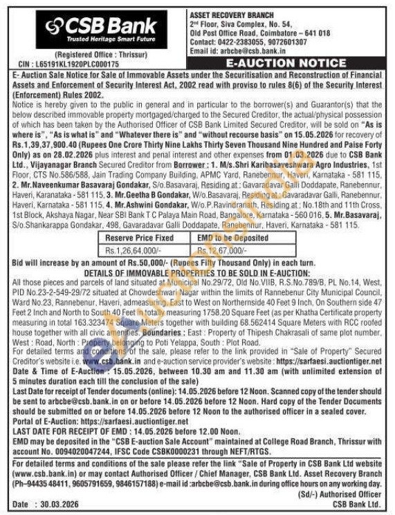 All those pieces and parcels of land situated at Municipal No.29/72, Old No. VIIB, R.S.No. 789/B, PL No. 14, West, PID No.23-2-549-29/72 situated at Chowdeshwari Nagar within the limits of Rannebenur City Municipal Council, Ward No.23, Rannebenur, Haveri, admeasuring, East to West on Northernside 40 Feet 9 Inch, On Southern side 47 Feet 2 Inch and North to South 40 Feet in totally measuring 1758.20 Square Feet (as per Khatha Certificate property measuring in total 163.323474 Square Meters together with building 68.562414 Square Meters with RCC roofed house together with all civic amenities. Boundaries: East: Property of Thipesh Chakrasali of same plot number. West: Road, North: Property belonging to Poti Yelappa, South: Plot Road.