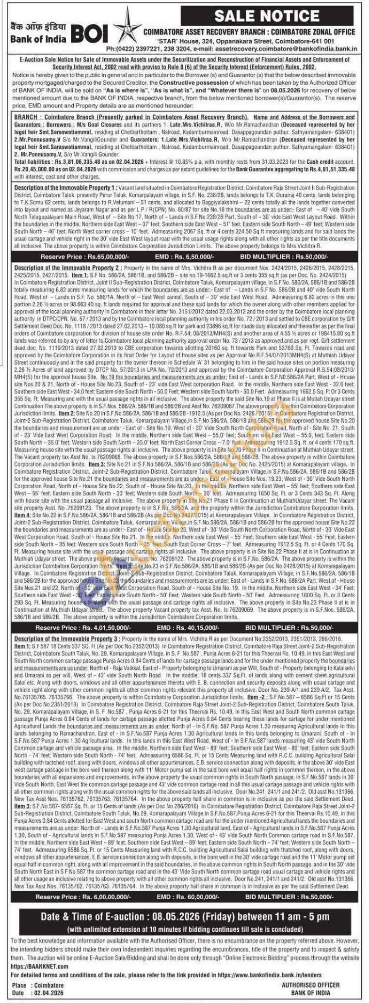 2425/2015, 2427/2015. Item 1: S.F No. 586/2A, 586/18, and 586/28-site no.19-1662.5 sq.ft or 3 cents 355 sq.ft (as per Doc. No. 2424/2015) In Coimbatore Registration District, Joint II Sub-Registration District, Coimbatore Taluk, Komarpalayam village, in S.F No. 586/2A, 585/18 and 586/28 totally measuring 6.82 acres measuring lands for which the boundaries are as under. East of Lands in S.F No. 586/28 and 40' vide South North Road, West of Lands in S.F. No. 586/1A, North of East West cannal, South of-30' vide East West Road. Admeasuring 6.82 acres in this one portion 2.26% acres or 98.663.40 sq. ft lands required for approval and these said lands for which the owner along with other members applied for approval of the local planning authority in Coimbatore in their letter No. 3151/2012 dated 22.03.2012 and the order by the Coimbatore local planning authority in DTPC/CPN. No. 57/2013 and by the Coimbatore local planning authority in his order No. 72/2013 and settled to CBE corporation by Gift Settlement Deed Doc. No. 1118/2013 dated 27.02.2013 10.080 sq.ft for park and 23896 sq.ft for roads duly allocated and thereafter as per the final orders of Coimbatore corporation for division of house site order No. R.F.54; 08/2013/MH4(S) and another area of 4.55% acres or 198415.80 sq.ft lands was referred to by any of letter to Coimbatore local planning authority approval order No. 73/2013 as approved and as per regt. Gift settlement deed doc. No. 1119/2013 dated 27.02.2013 to CBE corporation towards allotting 20160 sq. ft towards Park and 53760 Sq. Ft. Towards road and approved by the Coimbatore Corporation in its final Order for Layout of house sites as per Approval No.R.F.54/07/2013MH4(S) at Muthiah Udayar Street continuously and in the said property for the owner thereon in Schedule 'A' 31 belonging to him in the said house sites on portion measuring 2.26 1½ Acres of land approved by DTCP No. 57/2013 in LPA No. 72/2013 and approval by the Coimbatore Corporation Approval R.S.54:08/2013/MH4(S) for the approval house Site. No.19 the boundaries and measurements are as under; East of Lands in S.F.NO.586/2A Part, West of House site Nos. 20 & 21, North of House Site No.23, South of-23' vide East West corporation Road. In the middle, Northern side East West-32.6 feet; Southern side East West-34.0 feet: Eastern side South North-50.0 Feet: Western side South North-50.0 Feet. Admeasuring 1662.5 Sq. Ft Or 3 Cents 355 Sq. Ft. Measuring and with the usual passage rights in all inclusive. The above property the said Site No.19 at Phase II is at Mutiah Udayar street Continuation The above property is in S.F.Nos. 586/2A, 586/18 and 586/2B and Asst No. 76209067. The above property is within Coimbatore Corporation Jurisdiction limits. Item 2: Site No.20 in S.F.No.586/2A, 586/18 and 586/28-1912.5 (As per Doc No. 2426/2015) In Coimbatore Registration District, Joint-2 Sub-Registration District, Coimbatore Taluk, Komarpalayam Village, in S.F. No 586/2A, 586/18 and 586/28 for the approved house Site No.20 the boundaries and measurement are as under- East of-Site No.19, West of -30° Vide South North Corporation Road, North of Site No. 21, South of-23 Vide East West Corporation Road. In the middle, Northern side East West-55.0 feet, Southern side East West-55.0, feet, Eastern side South North-35.0' feet. Western side South North-35.0 feet: North East Corner Cross-7.0' feet. Admeasuring 1912.5 Sq. ft or 4 cents 170 sq.ft. Measuring house site with the usual passage rights all inclusive. The above property is in Site No.20 Phase II in Continuation at Muthiah Udayar street, The Vacant property tax Asst No. Is 76209068. The above property in S.F.Nos.586/2A, 586/18 and 586/28. The above property is within Coimbatore Corporation Jurisdiction limits. Item 3: Site No.21 in S.F.No.586/2A, 586/1B and 586/28 (As per Doc No. 2425/2015) at Komarapalayam village. In Coimbatore Registration District. Joint-2 Sub-Registration District, Coimbatore Taluk, Komarpalayam Village, in S.F.No.586/2A, 586/18 and 586/28 for the approved house Site No.21 the boundaries and measurements are as under:- East of House Site Nos. 19,23, West of -30° Vide South North Corporation Road, North of House Site No.22, South of House Site No.20. In the middle, Northern side East West-55' feet, Southern side East West-55 feet: Eastern side South North-30 feet; Western side South North-30 feet. Admeasuring 1650 Sq. Ft. or 3 Cents 343 Sq. Ft. Along with house site with the usual passage all inclusive. The above property in Site No.21 Phase II in Continuation at MuthiahUdayar street. The Vacant site property Asst. No 76209123. The above property is in S.F.No. 586/2A, and the property within the Jurisdiction Coimbatore Corporation limits. Item 4: Site No.22 in S.F.No.586/2A, 586/18 and 586/28 (As per Doc No.2427/2015) at Komarapalayam Village. In Coimbatore Registration District, Joint-2 Sub-Registration District, Coimbatore Taluk, Komarpalayam Village, in S.F.No.586/2A, 586/18 and 586/28 for the approved house Site No.22 the boundaries and measurements are as under:- East of-House Site No 23, West of-30 Vide South North Corporation Road, North of 30 Vide East West Corporation Road, South of House Site No.21. In the middle, Northern side East West-55' Feet; Southern side East West-55' Feet, Eastern side South North-35 feet, Western side South North-35 feet, South East Corner Cross-7' feet. Admeasuring 1912.5 Sq. Ft. or 4 Cents 170 Sq. Ft. Measuring house site with the usual passage and cartage rights all inclusive. The above property is in Site No.22 Phase II at is in Continuation at Muthiah Udayar street. The above property vacant tax asst. No. 76209122. The above property is in S.F.No. 586/2A. The above property is within the Jurisdiction Coimbatore Corporation limits. Item 5: Site No.23 in S.F.No.586/2A, 586/18 and 586/28 (As per Doc No.2428/2015) at Komarapalayam Village. In Coimbatore Registration District, Joint-2 Sub-Registration District, Coimbatore Talu