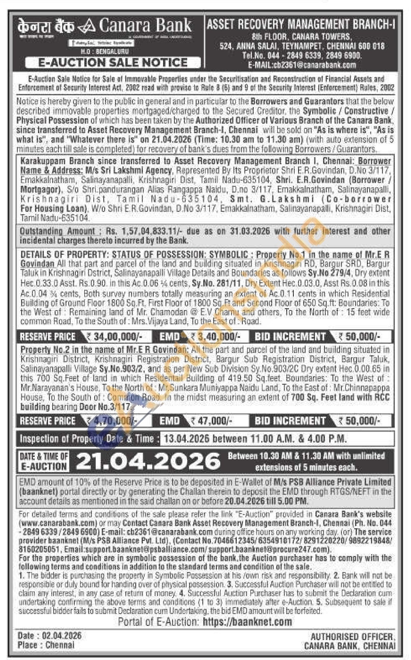 DETAILS OF PROPERTY: STATUS OF POSSESSION: SYMBOLIC: Property No.1 in the name of Mr.E R Govindan All that part and parcel of the land and building situated in Krishnagiri RD, Bargur SRD, Bargur Taluk in Krishnagiri Dstrict, Salinayanapalli Village Details and Boundaries as foliows Sy.No 279/4, Dry extent Het 0.33.0 Asst. Rs. 0.90. in this Ac. 0.06% cents, Sy. No. 281/11, Dry Extent Hec.0.03.0, Asst Rs. 0.08 in this Ac.0.04% cents, Both survey numbers totally measuring an extent of Ac.0.11 cents in which Residential Building of Ground Floor 1800 Sq. Ft, First Floor of 1800 Sq. Ft and Second Floor of 650 Sq.ft: Boundaries: To the West of Remaining land of Mr. Chamodan @ EV Chamu and others, To the North of: 15 feet wide common Road. To the South of: Mrs. Vijaya Land, To the East of: Road.