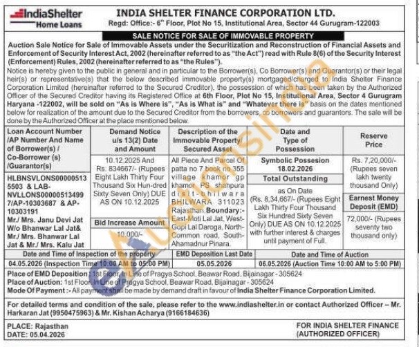All Piece And Parcel Of patta no 7 book no 355 village khamor P khamor PS shahpura distt-bhilwara BHILWARA 311023 Rajasthan Boundary: East-Moti Lal Jat, West-Gopi Lal Daroga, North-Common road, South-Ahamadnur Pinara.