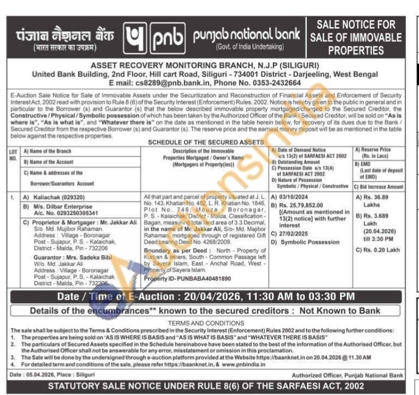 All that part and parcel of property situated at J. L. No. 143. Khatian No. 482, L. R. Khatian No. 1846, Plot No. 746, Mouza Boronagar, P.S.-Kalaichak, District Malda, Classification-Bagan, measuring total land area of 3.3 Decimal, Rahaman, mortgaged through of registered Gift in the name of Mr. Jakkar Ali, Sio-Md. MajiborDeed bearing Deed No. 4268/2009