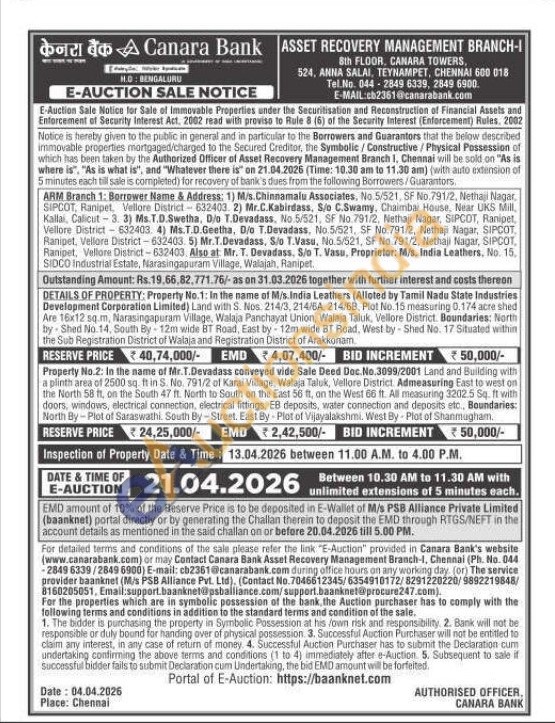 Property No.2: In the name of Mr.T.Devadass conveyed vide Sale Deed Doc. No.3099/2001 Land and Building with a plinth area of 2500 sq. f in S. No. 791/2 of Karai Village, Walaja Taluk, Vellore District. Admeasuring East to west on the North 58 ft, on the South 47 ft. North to South on the East 56 tt, on the West 66 ft. All measuring 3202.5 Sq. ft with doors, windows, electrical connection, electrical fittings, EB deposits, water connection and deposits etc., Boundaries: North By-Plot of Saraswathi. South By-Street. East By-Plot of Vijayalakshmi. West By Plot of Shanmugham.