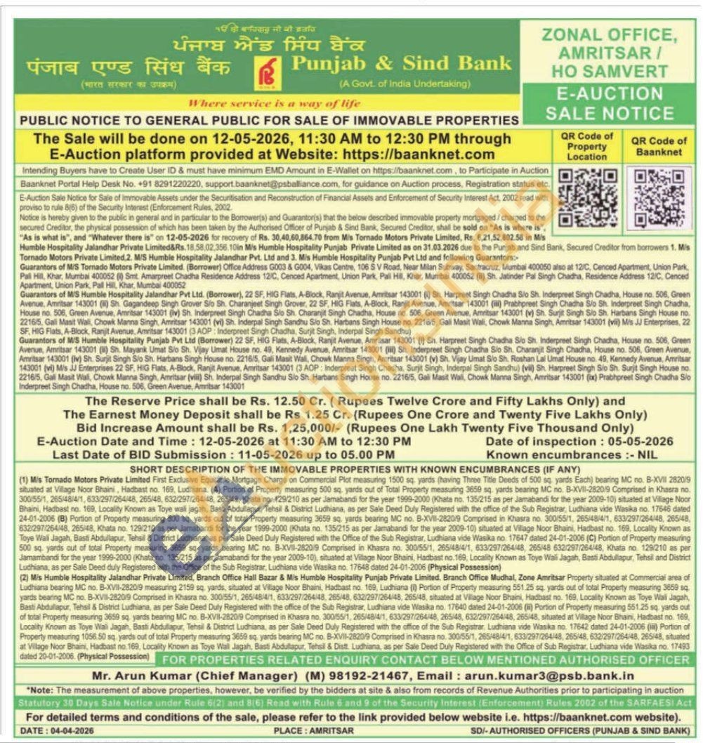(1) M/s Tornado Motors Private Limited First Exclusive Equitable Mortgage Charge on Commercial Plot measuring 1500 sq yards (having Three Title Deeds of 500 sq yards Each) bearing MC no. B-XVII 2820/9 situated at Village Noor Bhaini, Hadbest no. 169, Ludhiana. (A) Portion of Property measuring 500 sq. yards out of Total Property measuring 3659 sq, yards bearing MC no. B-XVII-282019 Comprised in Khasra no. 300/55/1, 265/48/4/1, 633/297/264/48, 265/48, 632/297/264/48, 265/48, Khata no. 129/210 as per Jamabandi for the year 1999-2000 (Khata no. 135/215 as per Jamabandi for the year 2009-10) situated at Village Noor Bhaini, Hadbast no. 169, Locality Known as Toye wall jagah, Basti Abdulapur, Tehsil & District Ludhiana, as per Sale Deed Duly Registered with the office of the Sub Registrar, Ludhiana vide Wasika no. 17646 dated 24-01-2006 (B) Portion of Property measuring 500 sq, yards out of total Property measuring 3659 sq. yards bearing MC no. B-XVII-2820/9 Comprised in Khasra no. 300/55/1, 265/48/4/1, 633/297/264/48, 265/48, 632/297/264/48, 265/48, Khata no. 1291210 as per Jamabandi for the year 1999-2000 (Khata no. 135/215 as per Jamabandi for the year 2009-10) situated at Village Noor Bhaini, Hadbast no. 169, Locality Known as Toye Wall Jagah, Basti Abdullapur, Tehsil & District Ludhiana, as per Sale Deed Duly Registered with the Office of the Sub Registrar, Ludhiana vide Wasika no. 17647 dated 24-01-2006 (C) Portion of Property measuring 500 sq. yards out of total Property measuring 3659 sq yards bearing MC no. B-XVII-282019 Comprised in Khasra no. 300/55/1, 265/48/4/1, 633/297/264/48, 265/48 632/297/264/48, Khata no. 129/210 as per Jamambandi for the year 1999-2000 (Khata no. 135/215 as per Jamabandi for the year 2009-10), situated at Village Noor Bhaini, Hadbast no. 169, Locality Known as Toye Wall Jagah, Basti Abdullapur, Tehsil and District Ludhiana, as per Sale Deed duly Registered with the Office of the Sub Registrar, Ludhiana vide Wasika no. 17648 dated 24-01-2006 (Physical Possession) (2) Mis Humble Hospitality Jalandhar Private Limited, Branch Office Hall Bazar & Mis Humble Hospitality Punjab Private Limited. Branch Office Mudhal, Zone Amritsar Property situated at Commercial area of Ludhiana bearing MC no. B-XV-282019 measuring 2159 sq, yards, situated at Village Noor Bhani, Hadbast no. 169, Ludhiana (Portion of Property measuring 551.25 sq yards out of total Property measuring 3659 sq. yards bearing MC no. B-XVS-28209 Comprised in Khasra no. 300/55/1, 265/484/1, 633/297/264/48, 265/48, 632/297/264/48, 265/48, situated at Village Noor Bhaini, Hadbast no. 160, Locality Known as Toye Wall Jagah, Basti Abdullapur, Tehsil & District Ludhiana, as per Sale Deed Duty Registered with the office of the Sub Registrar, Ludhiana vide Wasika no. 17640 dated 24-01-2006 (R) Portion of Property measuring 551.25 sq. yards out of total Property measuring 3659 sq yards bearing MC no. B-XVII-2820/9 Comprised in Khasra no. 300/55/1, 265/48/4/1, 633/297/264/48, 265/48, 632/297/264/48, 265/48, situated at Village Noor Bhan, Hadbest no. 169, Locality Known as Toye Wali Jagat, Basti Abdullapur, Tehsil & District Ludhiana, as per Sale Deed Duly Registered with the office of the Sub Registrar Ludhiana vide Wasika no. 17642 dated 24-01-2006 () Portion of Property measuring 1056.50 sq yards out of total Property measuring 3659 sq. yards bearing MC no. B-XVII-2820/9 Comprised in Khasra no. 300/55/1, 265/48/4/1, 633/297/264/48, 265/48,632/297/254/48, 265/48, situated at Village Noor Bhans, Hadbast no. 169, Locality Known as Toye Wall Jagah, Basti Abdullapur. Tehall & Distt. Ludhiana, as per Sale Deed Duly Registered with the Office of Sub Registrar Ludhiana vide Wasika no. 17493 dated 20-01-2006. (Physical Possession