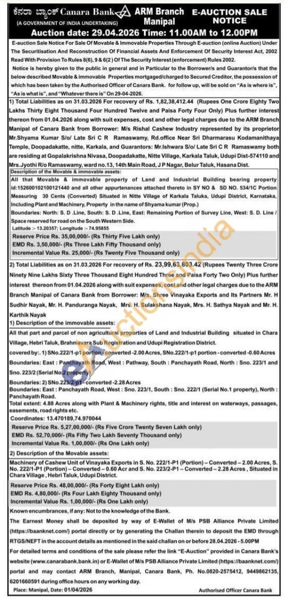 All that part and parcel of non agricultural properties of Land and Industrial Building situated in Chara Village, Hebri Taluk, Brahmavara Sub Registration and Udupi Registration District.