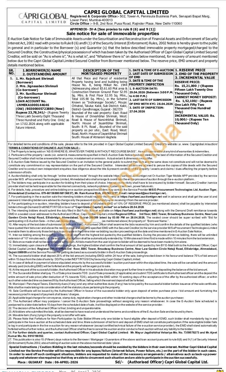 All that Piece and Parcel of residential Property having land and building being House No. 8, being Mikat No. 1944 (Admeasruing about 83.61.60 lot area & Construction thereon Ground Floor 52.95 Sq. Mtrs. & First Floor 52.95 Sq. Mtrs, Total 105.90 Sq. Mtrs.), in the Scheme Known as "Indiranagar Society, Mouje Chhatral, Taluka: Kalol, Sub District: Kalol, District-Gandhinagar, Gujarat-382729 Bounded of the said property: East: Road & House of Dineshbhai neshbhai Shri Shrimali, West: Road & House of Narsinhbhai Shrimali, North House of Jayantibhai Shrimali, South: 8 Ft. Road, Bounded of the said property as per site, East: Road, West: Road, North: House of Jayantibhai Shrimali South: House of Atmaram Vaghela