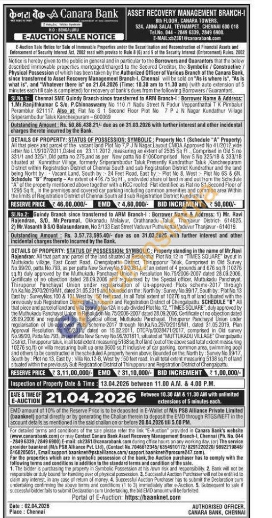 DETAILS OF PROPERTY: STATUS OF POSSESSION: SYMBOLIC: Property standing in the name of Mr. Ravi Rajendran: All that part and parcel of the land situated at Residential Plot No. 12 in "TIMES SQUARE RE layout in Muttukadu village, East Coast Road, Chengalpattu District, Thirupporur Taluk, Comprised in Old Survey No. 99/20, patta No. 793, as per patta New SurveyNo. 99/2061J, of an extent of 4 grounds and 676 sq.ft (10276 sq.ft) duly approved by the Muthukadu Panchayat Union in Resolution No. 75/2006-2007 dated 28.09.2006. Certificate of no objection dated 28.09.2006 and regularised by the Special officer, Muttukadu Panchayat Thiruporur Panchayat Union under regularisation of Un-approved Plots scheme-2017 through Nn. Ka No.2970/2019/M1, dated 31.05.2019 and bounded on the North by: Survey No 99/17, South by: Plot No. 13 East by: SurveyNos. 100 & 101 West by: 50 feet road, in all Total extent of 10276 sq.ft of land situated with the previously sub Registration District of Thiruporur and Registration District of Chengalpattu. SCHEDULE "B" All that piece and parcel of land and villa bearing No. 12A in sub-divided Plot No. 12, "TIMES SQUARE", duly approved by the Muthukadu Panchayat Union in Resolution No.75/2006-2007 dated 28.09.2006, Certificate of no objection dated 28.09.2006 and regularsed by the Special officer, Muttukadu Panchayat. Thiruporur Panchayat Union under regularisation of Lin-approved Plots scheme-2017 through Nn.Ka.No.2970/2019/M1, dated 31.05.2019, Pian Approval Resolution No.100/2011, dated on 15.02.2011, DTCP/p/0028471/2017, comprised in Old survey No.99/20, Patta No. 793, as per patta New Survey No 99/201811, situated at "MUTTUKADU VILLAGE Chengalpattu District, Thirupporurtaluk, in all total extent measuring 5138 sq ft of land (out of the above said total extent measuring 10276 sq.ft) on villa measuring built up area 3600 sq.ft inclusive of car parking, common area, swimming pool and others to be constructed in the scheduled A property herein above, Bounded on the North by: Survey No.99/17, South by Plot no.13, East by: Villa No. 12-8, West by: 50 feet road. In all total extent measuring 5138 sq.ft of land