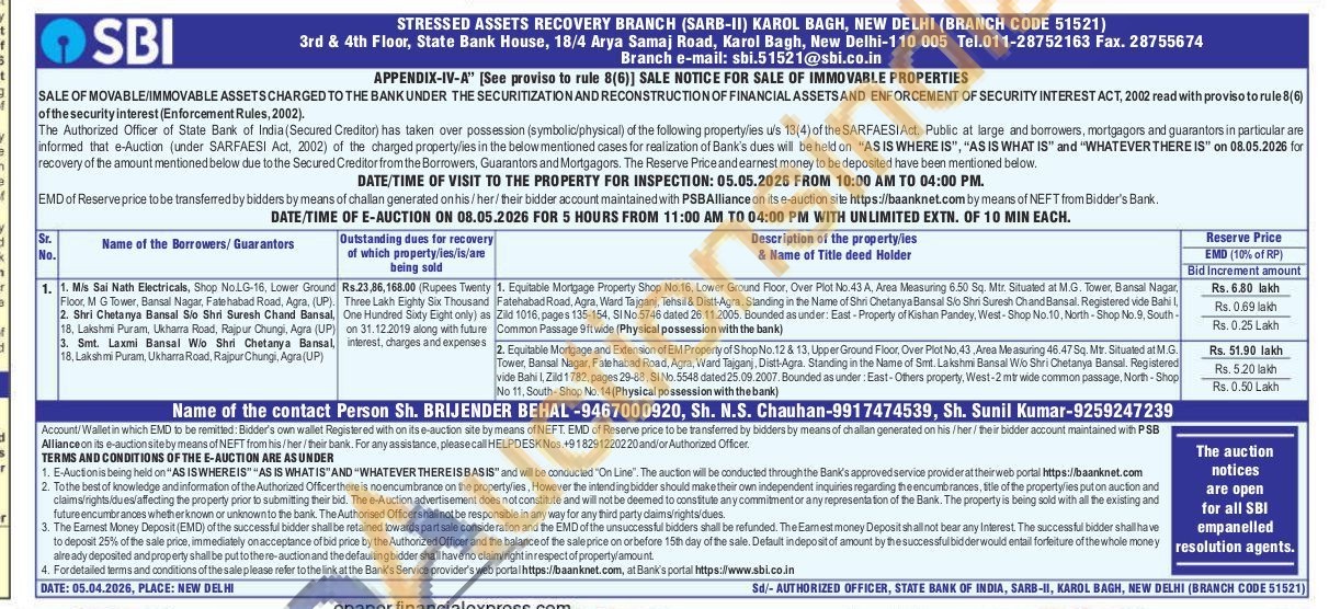 Equitable Mortgage Property Shop No.16, Lower Ground Floor, Over Plot No.43 A, Area Measuring 6.50 Sq. Mtr. Situated at M.G. Tower, Bansal Nagar, Fatehabad Road, Agra, Ward Tajganj, Tehsil & Distt-Agra. Standing in the Name of Shri Chetanya Bansal Sio Shri Suresh Chand Bansal. Registered vide Bahi I. Zild 1016, pages 135-154, SINo.5746 dated 26.11.2005, Bounded as under: East-Property of Kishan Pandey, West-Shop No.10, North-Shop No.9, South-Common Passage 9ft wide (Physical possession with the bank)