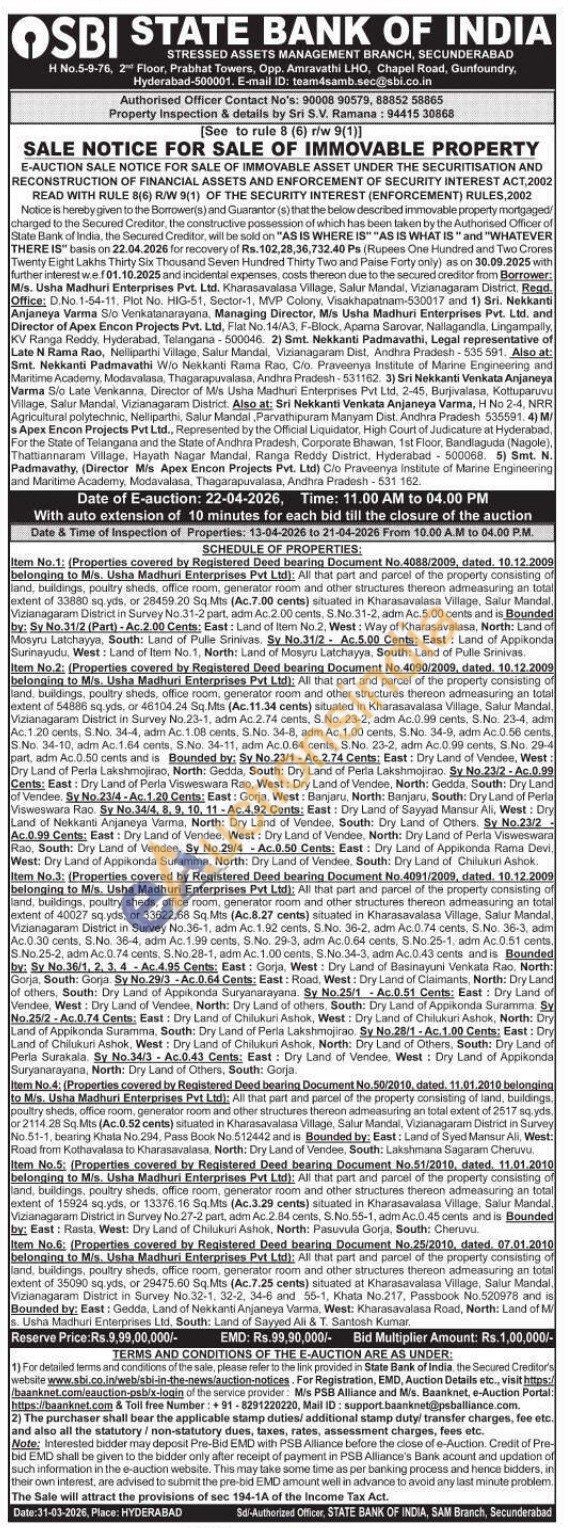 Item No.1: (Properties covered by Registered Deed bearing Document No.4088/2009, dated. 10.12.2009 belonging to M/s. Usha Madhuri Enterprises Pvt Ltd): All that part and parcel of the property consisting of land, buildings, poultry sheds, office room, generator room and other structures thereon admeasuring an total extent of 33880 sq.yds, or 28459.20 Sq.Mts (Ac.7.00 cents) situated in Kharasavalasa Village, Salur Mandal, Vizianagaram District in Survey No.31-2 part, adm Ac.2.00 cents, S.No.31-2, adm Ac.5.00 cents and is Bounded by: Sy No.31/2 (Part)-Ac.2.00 Cents: East: Land of Item No.2, West: Way of Kharasavalasa, North: Land of Mosyru Latchayya, South: Land of Pulle Srinivas. Sy No.31/2 Ac.5.00 Cents: East: Land of Appikonda Surinayudu, West: Land of Item No.1, North: Land of Mosyru Latchayya, South: Land of Pulle Srinivas. Item No.2: (Properties covered by Registered Deed bearing Document No. 4090/2009, dated. 10.12.2009 belonging to M/s. Usha Madhuri Enterprises Pvt Ltd): All that part and parcel of the property consisting of land, buildings, poultry sheds, office room, generator room and other structures thereon admeasuring an total extent of 54886 sq.yds, or 46104.24 Sq.Mts (Ac. 11.34 cents) situated in Kharasavalasa Village, Salur Mandal, Vizianagaram District in Survey No.23-1, adm Ac. 2.74 cents, S.No. 23-2, adm Ac.0.99 cents, S.No. 23-4, adm Ac.1.20 cents, S.No. 34-4, adm Ac. 1.08 cents, S.No. 34-8, adm Ac. 1.00 cents, S.No. 34-9, adm Ac.0.56 cents, S.No. 34-10, adm Ac.1.64 cents, S.No. 34-11, adm Ac.0.64 cents, S.No. 23-2, adm Ac.0.99 cents, S.No. 29-4 part, adm Ac.0.50 cents and is Bounded by: Sy No.23/1-Ac.2.74 Cents: East: Dry Land of Vendee, West: Dry Land of Perla Lakshmojirao, North: Gedda, South: Dry Land of Perla Lakshmojirao. Sy No.23/2-Ac.0.99 Cents: East: Dry Land of Perla Visweswara Rao, West: Dry Land of Vendee, North: Gedda, South: Dry Land of Vendee. Sy No. 23/4-Ac. 1.20 Cents: East: Gorja, West: Banjaru, North: Banjaru, South: Dry Land of Peria Visweswara Rao. Sy No.34/4, 8, 9, 10, 11-Ac.4.92 Cents: East: Dry Land of Sayyad Mansur Ali, West: Dry Land of Nekkanti Anjaneya Varma, North: Dry Land of Vendee, South: Dry Land of Others. Sy No.23/2 Ac.0.99 Cents: East: Dry Land of Vendee, West: Dry Land of Vendee, North: Dry Land of Perla Visweswara Rao, South: Dry Land of Vendee. Sy No.29/4-Ac.0.50 Cents: East: Dry Land of Appikonda Rama Devi. West: Dry Land of Appikonda Suramma, North: Dry Land of Vendee, South: Dry Land of Chilukuri Ashok. Item No.3: (Properties covered by Registered Deed bearing Document No. 4091/2009, dated. 10.12.2009 belonging to M/s. Usha Madhuri Enterprises Pvt Ltd): All that part and parcel of the property consisting of land, buildings, poultry sheds, office room, generator room and other structures thereon admeasuring an total extent of 40027 sq.yds, or 33622.68 Sq. Mts (Ac.8.27 cents) situated in Kharasavalasa Village, Salur Mandal, Vizianagaram District in Survey No.36-1, adm Ac. 1.92 cents, S.No. 36-2, adm Ac.0.74 cents. S.No. 36-3, adm Ac.0.30 cents, S.No. 36-4, adm Ac. 1.99 cents, S.No. 29-3, adm Ac.0.64 cents, S.No.25-1, adm Ac.0.51 cents. S.No.25-2, adm Ac.0.74 cents, S.No.28-1, adm Ac. 1.00 cents, S.No.34-3, adm Ac.0.43 cents and is Bounded by: Sy No.36/1, 2, 3, 4 Ac.4.95 Cents: East: Gorja, West: Dry Land of Basinayuni Venkata Rao, North: Gorja, South: Gorja. Sy No.29/3-Ac.0.64 Cents: East: Road, West: Dry Land of Claimants, North: Dry Land of others, South: Dry Land of Appikonda Suryanarayana. Sy No.25/1 Ac.0.51 Cents: East: Dry Land of Vendee, West: Dry Land of Vendee, North: Dry Land of others, South: Dry Land of Appikonda Suramma. Sy No.25/2-Ac.0.74 Cents: East: Dry Land of Chilukuri Ashok, West: Dry Land of Chilukuri Ashok, North: Dry Land of Appikonda Suramma, South: Dry Land of Perla Lakshmojirao. Sy No.28/1-Ac. 1.00 Cents: East: Dry Land of Chilukuri Ashok, West: Dry Land of Chilukuri Ashok, North: Dry Land of Others, South: Dry Land of Perla Surakala. Sy No.34/3-Ac.0.43 Cents: East: Dry Land of Vendee, West: Dry Land of Appikonda Suryanarayana, North: Dry Land of Others, South: Gorja. Item No.4: (Properties covered by Registered Deed bearing Document No.50/2010, dated, 11.01.2010 belonging to M/s. Usha Madhuri Enterprises Pvt Ltd): All that part and parcel of the property consisting of land, buildings, poultry sheds, office room, generator room and other structures thereon admeasuring an total extent of 2517 sq. yds, or 2114.28 Sq. Mts (Ac.0.52 cents) situated in Kharasavalasa Village, Salur Mandal, Vizianagaram District in Survey No.51-1, bearing Khata No.294. Pass Book No.512442 and is Bounded by: East: Land of Syed Mansur Ali, West: Road from Kothavalasa to Kharasavalasa, North: Dry Land of Vendee, South: Lakshmana Sagaram Cheruvu. Item No.5: (Properties covered by Registered Deed bearing Document No.51/2010, dated. 11.01.2010 belonging to M/s. Usha Madhuri Enterprises Pvt Ltd): All that part and parcel of the property consisting of land, buildings, poultry sheds, office room, generator room and other structures thereon admeasuring an total extent of 15924 sq.yds, or 13376.16 Sq.Mts (Ac.3.29 cents) situated in Kharasavalasa Village, Salur Mandal, Vizianagaram District in Survey No.27-2 part, adm Ac.2.84 cents, S.No.55-1, adm Ac.0.45 cents and is Bounded by: East: Rasta, West: Dry Land of Chilukuri Ashok, North: Pasuvula Gorja, South: Cheruvu.
