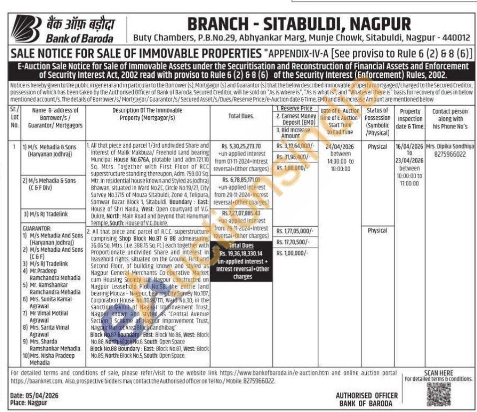 All that piece and parcel 1/3rd undivided Share and Interest of Malik Makbuza/ Freehold Land bearing Muncipal House No.576A, plotable land adm.721.10 Sq. Mtrs. Together with First Floor of RCC superstructure standing thereupon, Adm. 759.00 Sq. Mtr. in residential house known and Styled as jodhraj Bhawan, situated in Ward No.20, Circle No.19/27, City Survey No.3715 of Mouza Sitabuldi, Zone 4, Telipura, Somwar Bazar Block 1, Sitabuldi. Boundary East: House of Shri Naidu, West: Open courtyard of V.G. Dukre, North: Main Road and beyond that Hanuman Temple, South: House of V G.Dukre