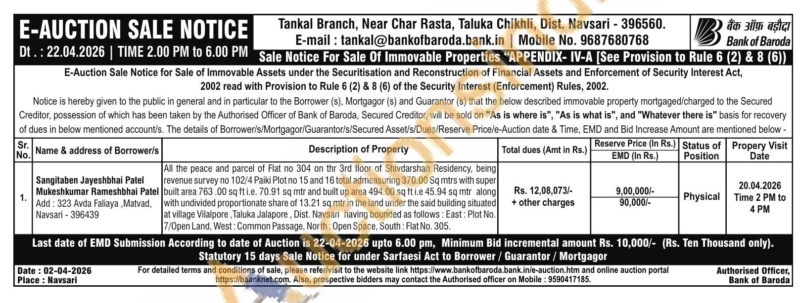 the peace and parcel of Flat no 304 on thr 3rd floor of Shivdarshan Residency, being revenue survey no 102/4 Paiki Plot no 15 and 16 total admeasuring 370.00 Sq mtrs with super built area 763.00 sq fti.e. 70.91 sq mtr and built up area 494.00 sq ft i.e 45.94 sq mtr along with undivided proportionate share of 13.21 sq mtr in the land under the said building situated at village Vilalpore, Taluka Jalapore, Dist. Navsari having bounded as follows: East: Plot No. 7/Open Land, West: Common Passage, North: Open Space, South: Flat No. 305.