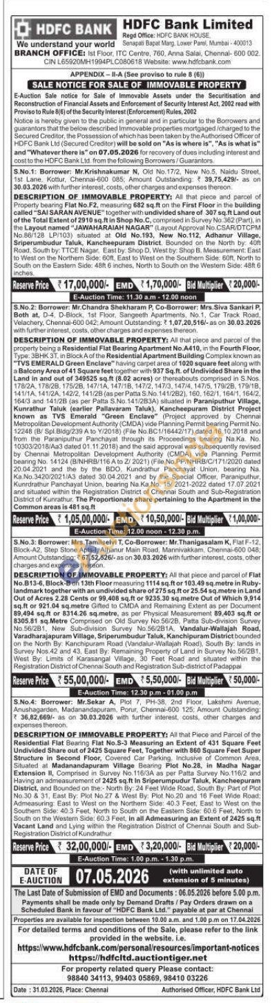 2. All that piece and parcel of the property being a Residential Flat Bearing Apartment No.A410, in the Fourth Floor, Type: 3BHK 3T, in Block A of the Residential Apartment Building Complex known as "TVS EMERALD Green Enclave" having carpet area of 1020 square feet along with a Balcony Area of 41 Square feet together with 937 Sq.ft. of Undivided Share in the Land in and out of 349525 sq.ft (8.02 acres) or thereabouts comprised in S.Nos. 178/2A, 178/28, 175/28, 147/14, 147/18, 147/2, 147/3, 147/4, 147/5, 179/28, 179/18, 141/1A, 141/2A, 142/2, 141/2B (as per Patta S.No. 141/282), 160, 162/1, 164/1, 164/2, 164/3 and 141/2B (as per Palta S.No. 141/283A) situated in Paraniputhur Village, Kunrathur Taluk (earlier Pallavaram Taluk), Kancheepuram District Project known as TVS Emerald "Green Enclave" (Project approved by Chennai Metropolitan Development Authority (CMDA) vide Planning Permit bearing Permit No. 12248 (B/ Spl. Bldg/239 A to Y/2018) (File No. BC1/16442/17) dated 16.10.2018 and from the Paraniputhur Panchayat through its Proceedings bearing Na Ka. No. 10303/2018/Aa3 dated 01.11.2018) and the said approval was subsequently revised by Chennai Metropolitan Development Authority (CMDA) vide Planning Permit bearing No. 14124 (B/NHRB/116 A to Z/2021) (File No.PP/NHRB/C/171/2020 dated 20.04.2021 and the by the BDO, Kundrathur Panchayat Union, bearing Na. Ka.No.3420/2021/A3 dated 30.04.2021 and by the Special Officer, Paraniputhur, Kunrdrathur Panchayat Union, bearing Na.Ka.No. 15/2021-2022 dated 17.07.2021 and situated within the Registration District of Chennai South and Sub-Registration District of Kunrathur. The Proportionate share pertaining to the Apartment in the Common areas is 481 sq.ft