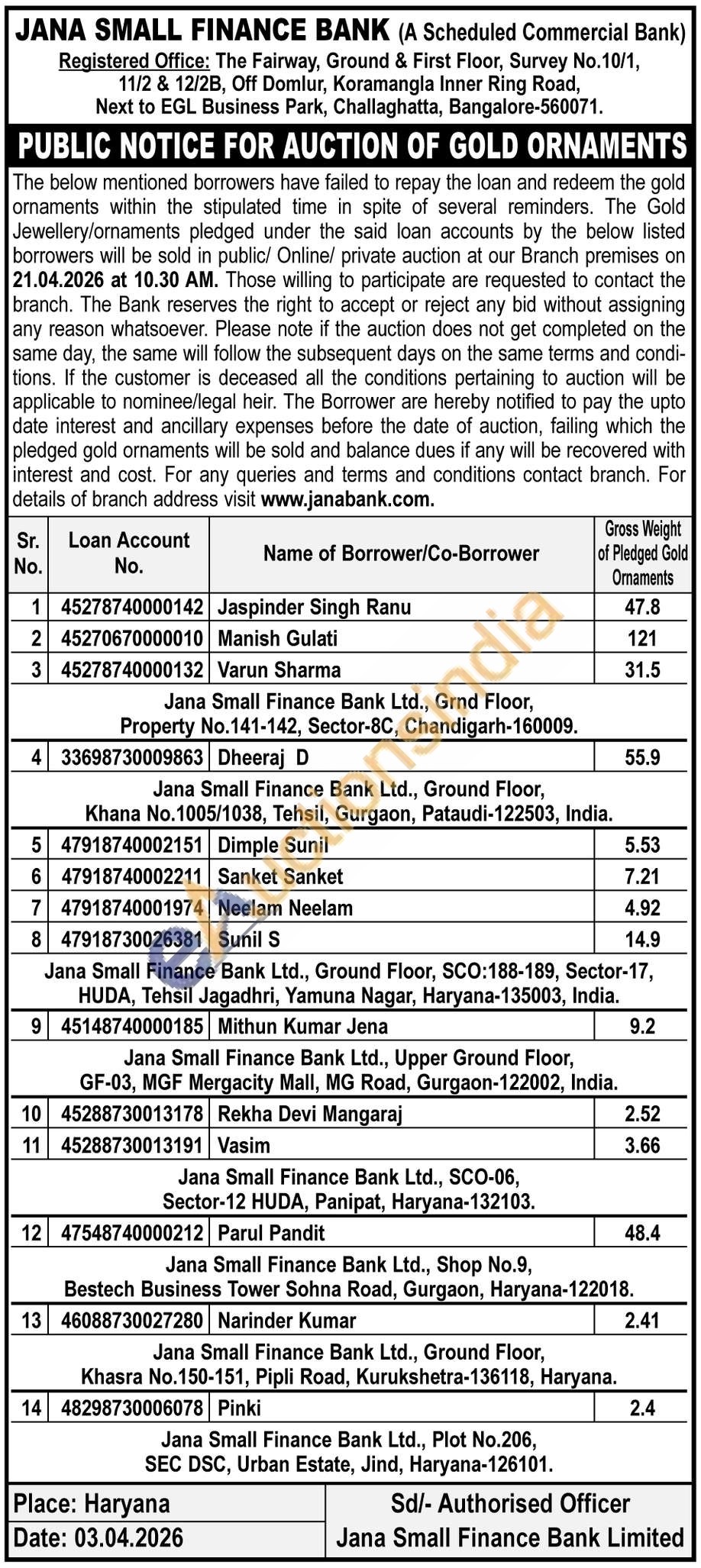Jana Small Finance Bank Gold Auctions Auction in Chandigarh