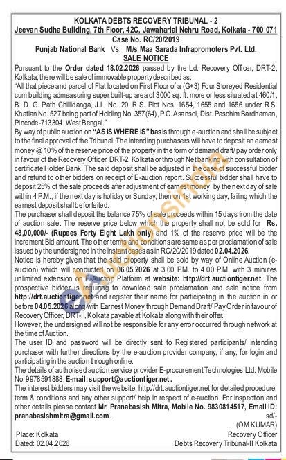 All that piece and parcel of Flat located on First Floor of a (G+3) Four Storeyed Residential cum building admeasuring super built-up area of 3000 sq. ft. more or less situated at 460/1, B. D. G. Path Chillidanga, J.L. No. 20, R.S. Plot Nos. 1654, 1655 and 1656 under R.S. Khatian No. 527 being part of Holding No. 357 (64), P.O. Asansol, Dist. Paschim Bardhaman, Pincode-713304, West Bengal."