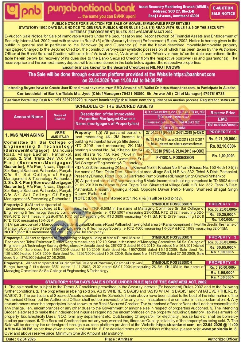 All part and parcel of Engineering college building at Mohal Purani, Mouza S Padhiarkhar, Tehsil Palampur District Kangra measuring 102 19 Kanal in the name of Managing Committee Sri Sai College of Engineering & Technology Society @Registered vide sale deed No. 267/2010 dated 16.02 2010, Sale deed No. 268/2010 dated 16.02.2010, Sale deed No. 1596/2009 dated 15.10.2009, Sale deed No. 1597/2009 dated 15.10.2009, Sale deed No. 1291/2009 dated 10.08.2009, Sale deed No. 1292/2009 dated 10.08.2009, Sale deed No. 1375/2009 dated 27.08.2009, Sale deed No. 1376/2009 dated 27.08.2009.